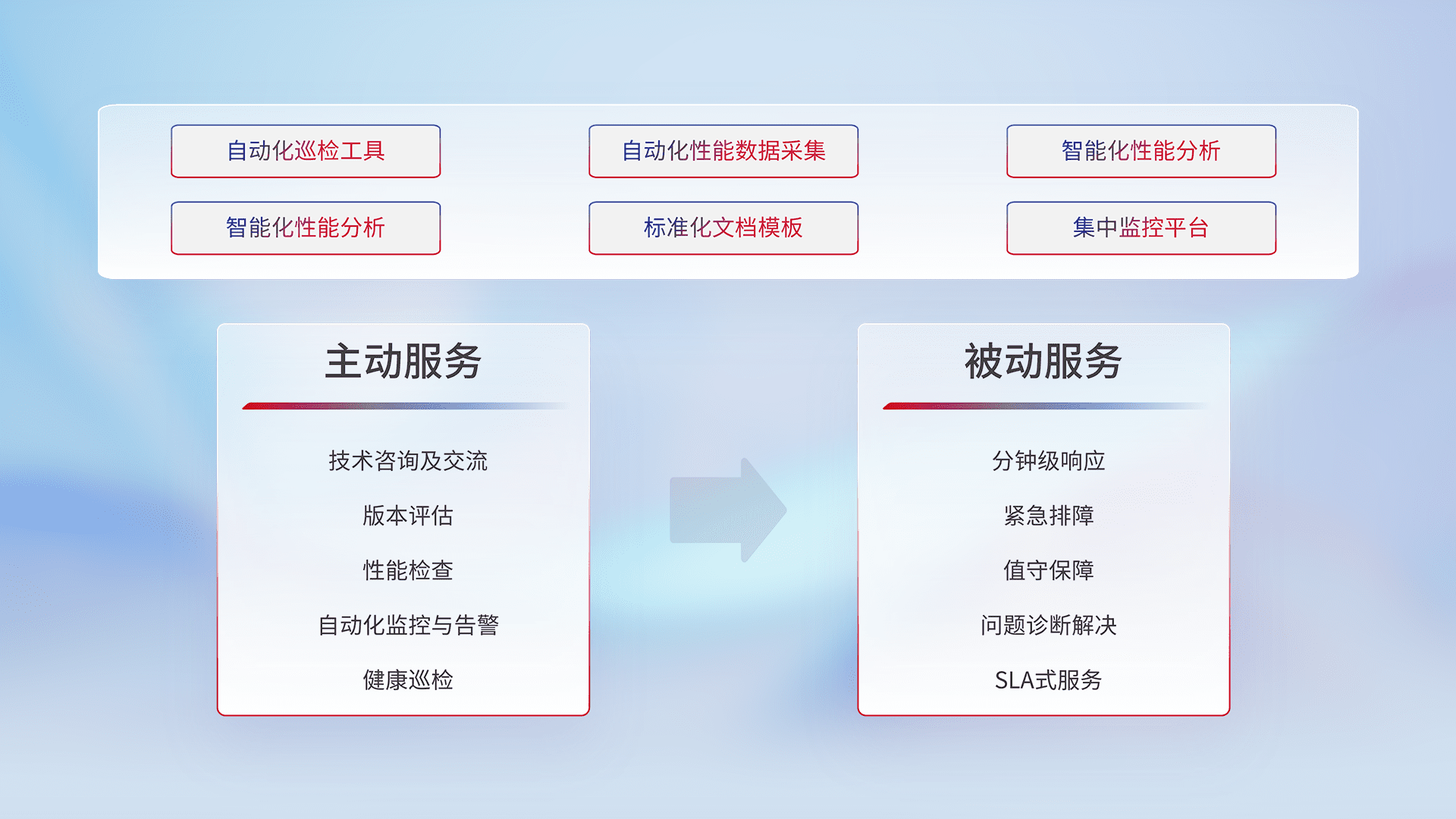 智能化工具和标准化文档,,,,保障服务质量,,,,提供主动服务(包含技术咨询、、版本评估、、、性能检查、、自动化监控与告警、、、健康巡检)和被动服务包含(分钟级响应、、紧急排障、、、、值守保障、、问题诊断解决、、、SLA服务)。。